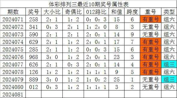 体彩排列三最近10期分别开出奖号:258、341、590、629、285、968、626、126、889、012,各奖号属性详见下表: