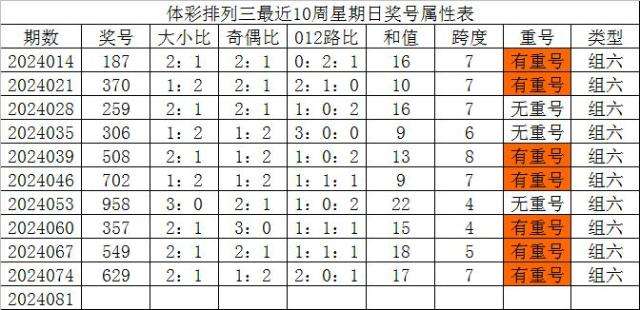 体彩排列三最近10周星期日奖号分别为:187、370、259、306、508、702、958、357、549、629,各奖号属性详见下表:
