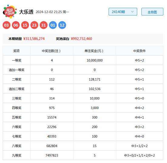 大乐透第2024140期开出奖号:前区03、06、15、23、31,后区01、12。当期前区012路比为3:1:1,奇偶比为4:1,和值为78,跨度为28,后区奖号出现在一、三区。