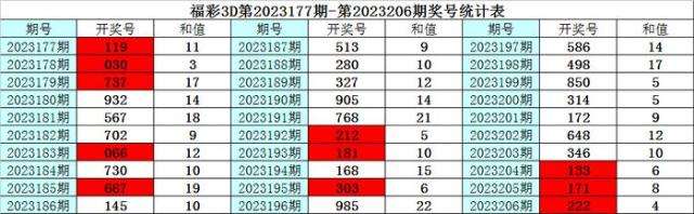 上期回顾:福彩3D第2023206期奖号为:222,其中奖号组选类型为:豹子,奇偶比为0:3,大小比为0:3,012路比为0:0:3,和值为6,跨度为0。