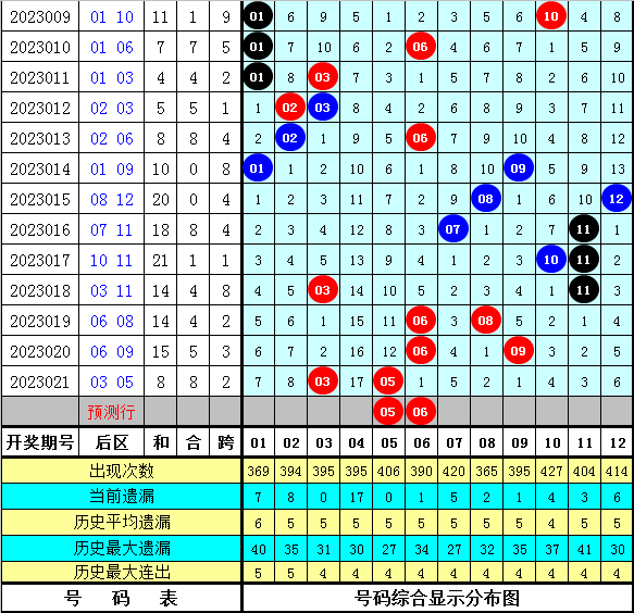 前区奇偶比3:2,前区大小比3:2,前区012路比3:0:2,前区和值为79,前区极距为25,与上期有1个同号:23。