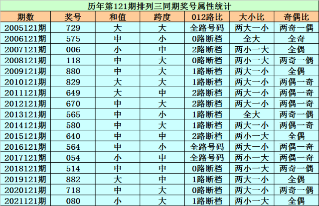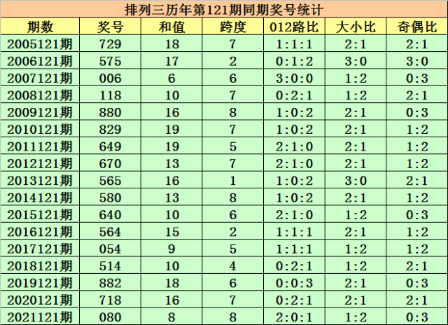 历史上第2022121期排列三已开出17期奖号了,历年同期奖号分别为:729、575、006、118、880、829、649、670、565、580、640、564、054、514、882、718、080,详细统计见下表: