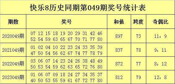 奇偶比分析:去年第049期奖号奇偶比为12:8,历史同期第049期奖号奇偶总比例为40:40,奇偶号码表现与理论基本相当,今年第049期看好偶数号码表现活跃,关注奇偶比7:13。