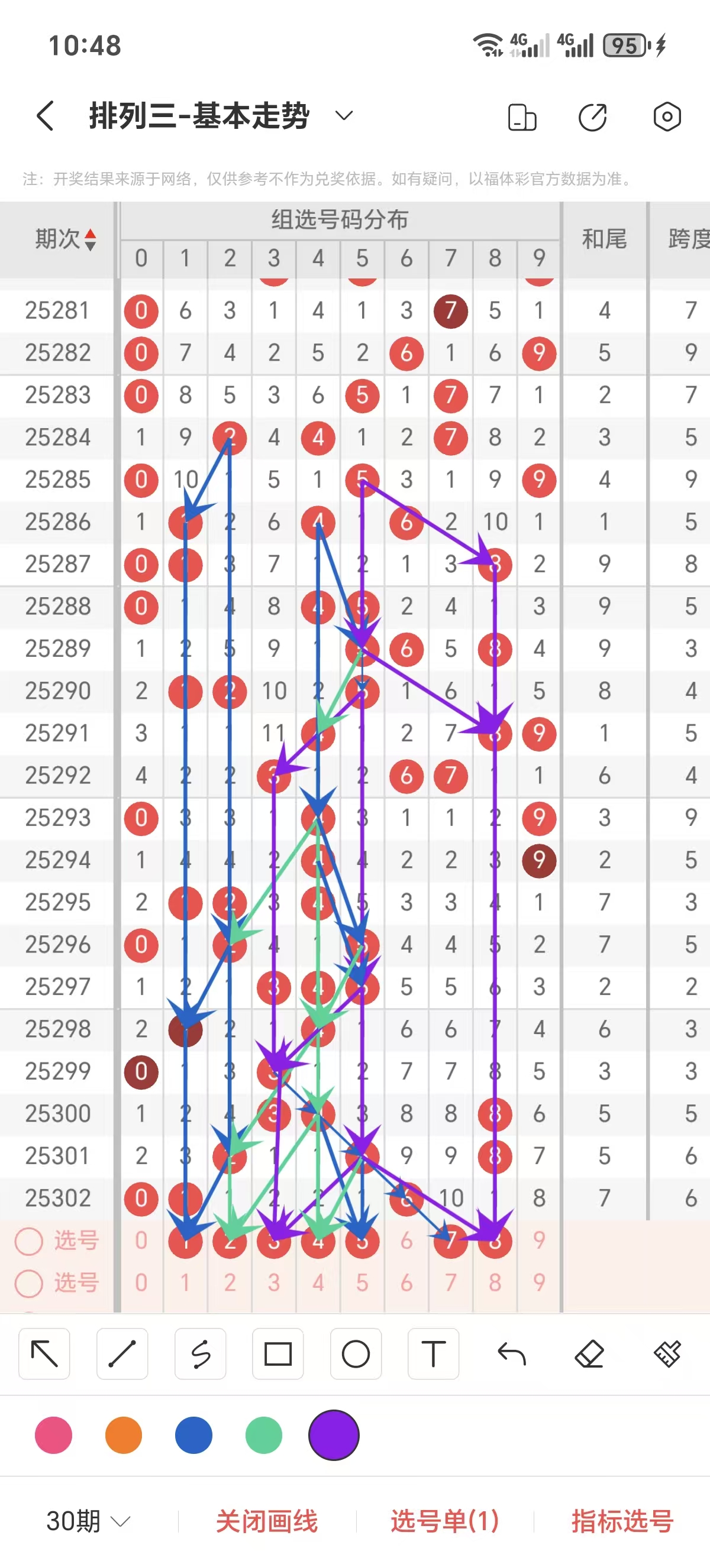 通常情况下在五期之内重复一个跨度的概率较高,近五期重复了3/6的跨度,近五期跨度为3/3/5/6/6,近期0路的跨度较热,本期要侧重3/5/6跨为主的号码组合。选择好跨度就可以从跨度方面选择相应的双胆码组合,双胆码的选取要根据近期和历史的走势进一步的分析选取。