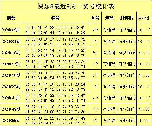 福彩快乐8第2024055期(上周二)奖号回顾:04 08 09 11 22 23 26 29 47 48 49 52 62 64 65 68 70 71 72 79,其中大小比为12:8,包含3个重号11、64、71,包含连码08 09、22 23、47 48 49、64 65、70 71 72。