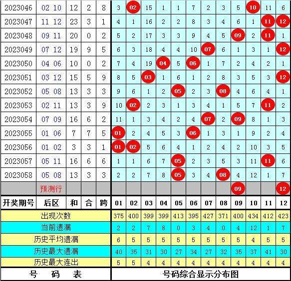 后区上期开出奖号:05+08,前6次后区奖号05+08出现之后,其下期分别开出号码:02+10、01+06、02+04、04+10、06+07、02+11,本期后区注意五码07 08 09 12,单挑两码09 12。