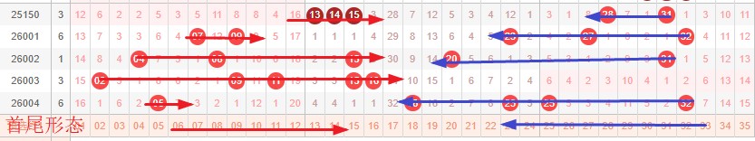 如图所示:首尾制约平衡组范围依次为:推拉推,推推? 本期形态范围优先选择红色左推首尾。由于上期号码处在首尾换4然后中间右推本期交换首尾移动空间连续分割形成间隔1正在重复走势预计本期继续形成走势,本期宜采取继续左推走势常规起号,或体现2连号组和间隔1走势。