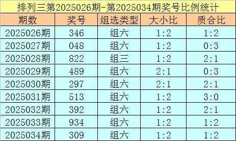 上期回顾:排列三第2025034奖号开出309,奖号质合比为1:2,大小比为1:2,跨度为9,类型为组六。