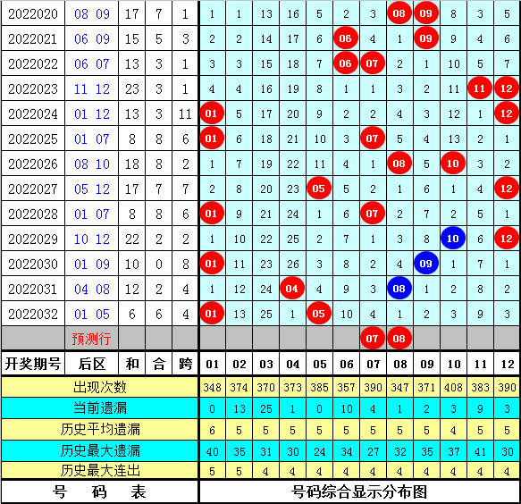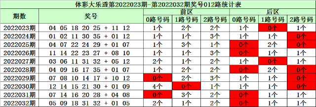 上期回顾:大乐透第22032期奖号为:05 09 18 31 32+01 05,其中前区号码012路比为2:1:2,后区号码012路比为0:1:1。