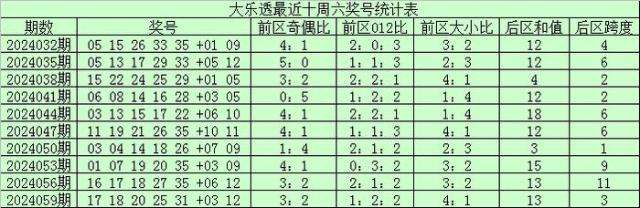 前区奇偶走势:上期前区奇偶比为4:1,上周六前区奇偶比3:2,最近十周六奇数号码表现占优,本期注意偶数号码回补转热,关注奇偶比1:4。