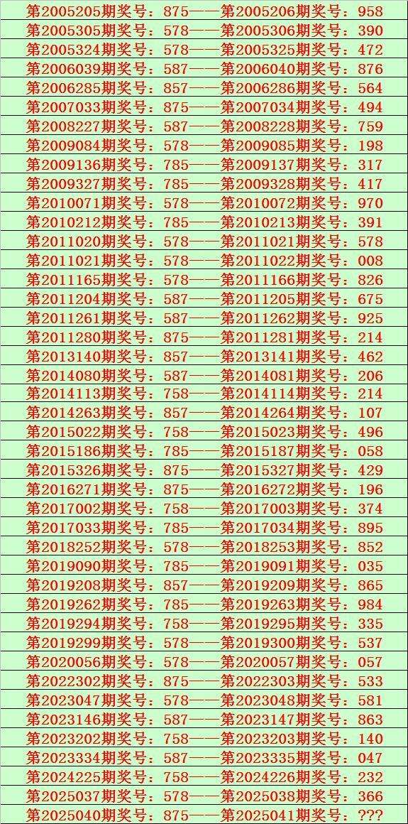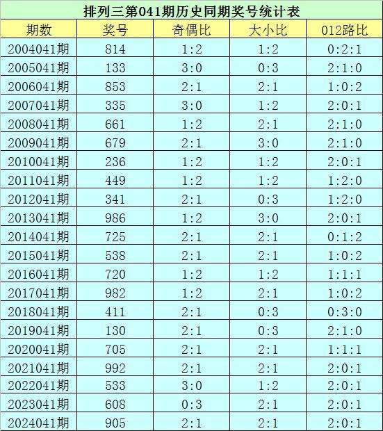 排列三第2025041期开奖日期:2025年2月20日,历史上第041期已开出了21次奖号,历年同期号码分别为:814、133、853、335、661、679、236、449、341、986、725、538、720、982、411、130、705、992、533、608、905。