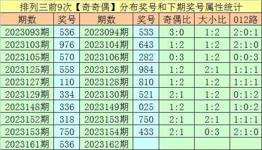 排列三第2023161期奖号为536,直选奇偶分布为:奇奇偶,该奇偶分布历史上共出现了795次,前100期出现16次。