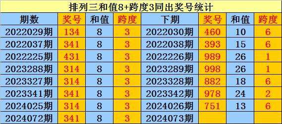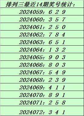 上期回顾:排列三第2024072期奖号:341。和值8,跨度3。