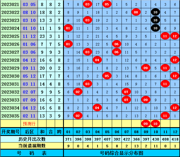 后区分析【一区01-04,二区05-08,三区09-12】:上期后区奖号为02和11,分别落在第一、三区,近50期后区三区比为33:32:35,近10期三区比为7:5:8,本期重防第三区号码大热,精选两码09+10。
