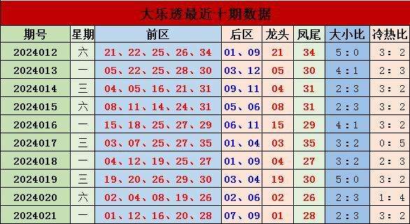 上期回顾,大乐透第2024021开奖,本期奖号:前区01 12 16 20 28;后区07 09,当期前区号码大小比为2:3,三区比2:2:1,奇偶比1:4。前区未开出连号,未开出重号。