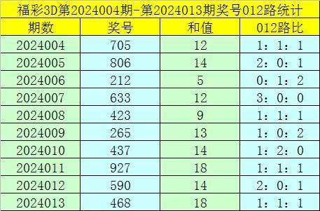上期回顾:福彩3D第2024013期开出奖号:468。奖号为组六形态,与试机号没有同,奇偶比为0:3,大小比为2:1,012路比为1:1:1,和值为18,跨度为4。