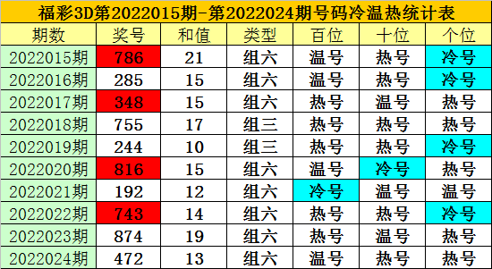 上期回顾:福彩3D第2022024期开奖奖号为:013,奖号类型为:组六,奖号冷温热态为:温号+热号+热号。