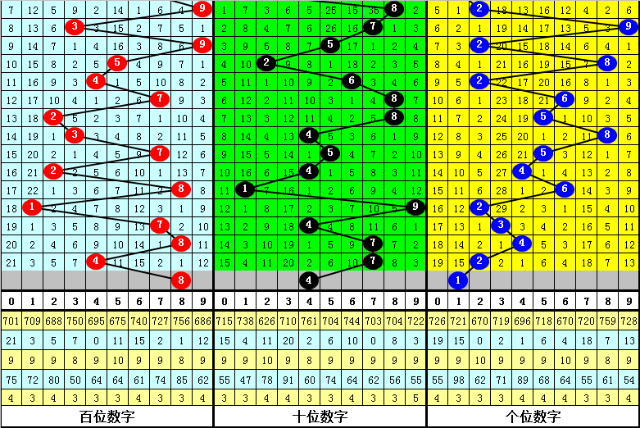 百位上期出现:温号4,该位连续十期以热号出现较多,以冷号出现较少,目前百位热号有5个:1、2、4、7、8,本期看好开出热号再次出现,参考号码8。