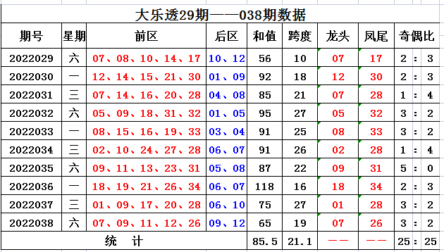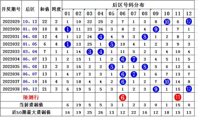 上期回顾,大乐透第2022038期开奖,本期奖号:前区07 09 11 12 26;后区09 12,当期前区号码大小比为1:4,三区比4:0:1,奇偶比为3:2。前区开出连号11 12,开出重号09。