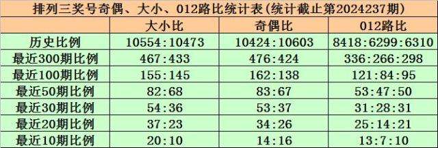 上期回顾:排列三第2024237期出现奖号356。开出组六,奇偶比2:1,012路比2:0:1,大小比2:1,和值14,跨度3。