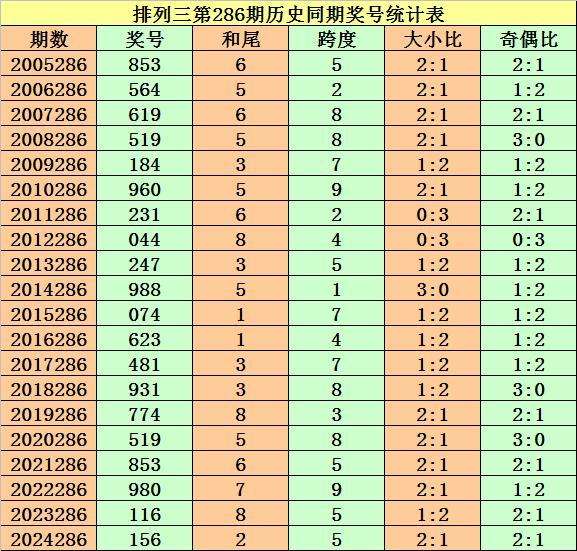 历年第286期排列三同期奖号开出:853、564、619、519、184、960、231、044、247、988、074、623、481、931、774、519、853、980、116、156。