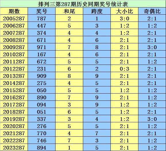 从2004年至今排列三已开出7058期奖号了,本期为排列三2024年第287期开奖,历史同期已出现19次奖号: