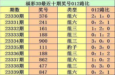 开奖回顾:第2023339期3D奖号为847。形态:组六,奇偶比1:2,大小比2:1,012路比为0:2:1。
