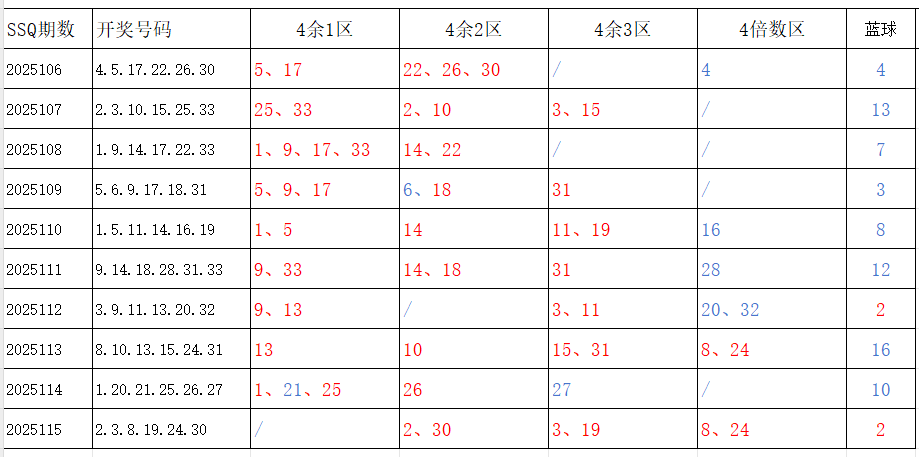 分享第一个数据分析:四分区统计数据。相对于传统的三分区,个人习惯使用四分区,就是把33个红球号码除以4,所得的余数分区如下: