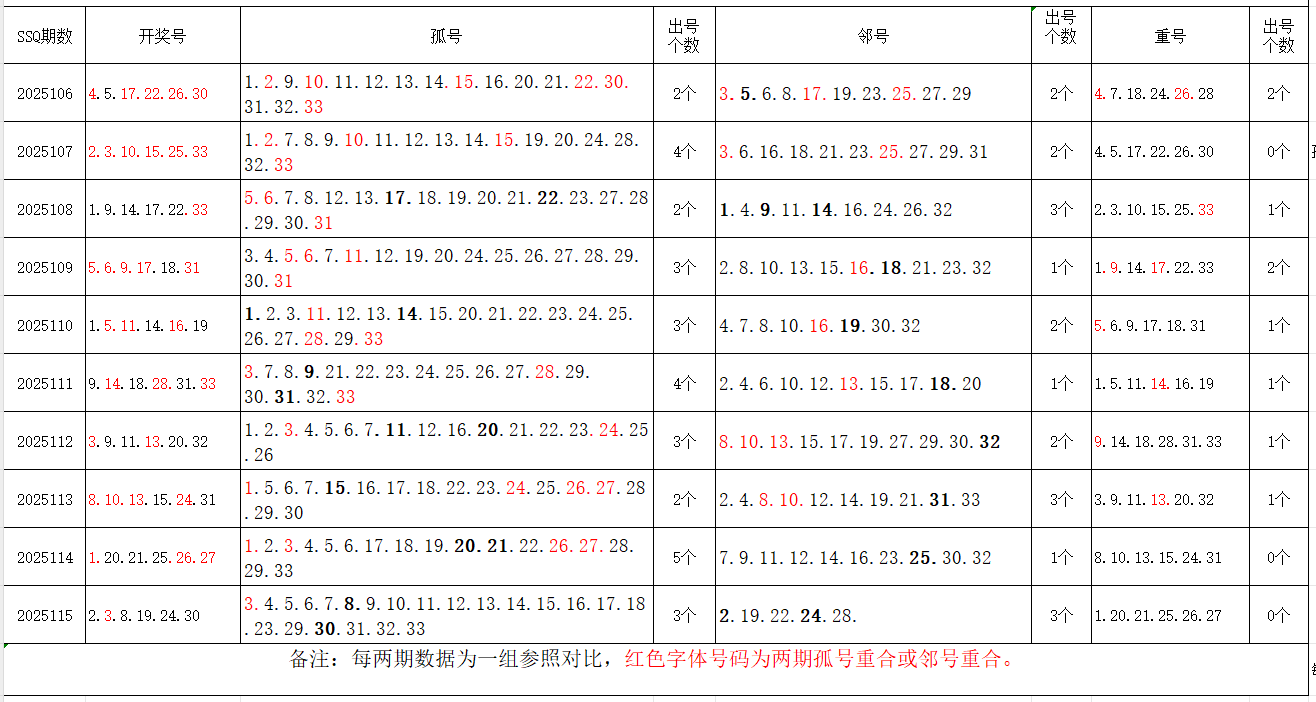 如图,以近两期数据为一组,进行对比分析。相同的孤号、邻号,可能在下期出1-4个左右。上期开出孤号3个,邻号3个,重号0个。本期参考孤号:5.6.10.11.12.13.14.15.16.17.21.22.26.27.28.32.33;邻号:1.4.7.9.18.20.23.25.29.31;孤、邻号重合号码精选:***(会员专区可见)。个人分析,仅供参考。