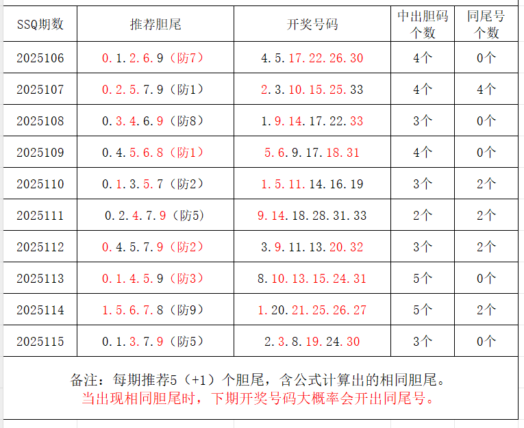 如图,每期推荐胆尾中出1-4个。上期推荐胆尾中出3尾3码!推荐胆尾是按照公式计算的顺序,不定位红球号码的顺序。本期推荐胆尾:0尾/2尾/3尾/7尾/8尾 。加推重点胆尾:***(会员专区可见)。推荐胆码号码:***(会员专区可见)。个人分析,仅供参考。