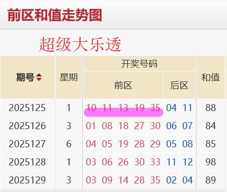 近五期大乐透开奖号码前区和值依次为88→84→85→98→89。前区和值均值为89。前区和值振幅为14,前区和值修正振幅为11。基于动态平衡干预以及波动趋势衡量,本期前区和值推测区间为78-100。基于风险对冲策略,本期前区和值区间缩水为78-100。基于前区和值分析,本期前区质数数量倾向于2-3枚。