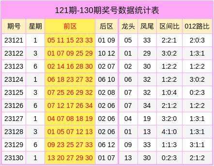 大乐透第2023130期奖号开出:13、20、27、29、30 + 01、07。其中前区三区比为0:2:3,012路比为2:1:2,后区开出“小大”+“奇奇”形态的号码01、07。