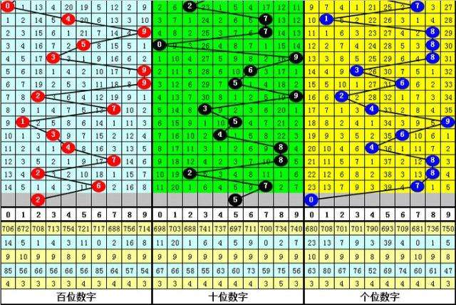 大中小分析:在组选0-9号码分布图中,前10期小 号(0-2区段)出现5枚奖号,中号(3-6区段)出现13枚奖号,大号(7-9区段)出现12枚奖号,上期0小 号区域断区,本期防大号转冷,预计7-9区段无号。