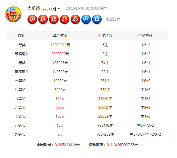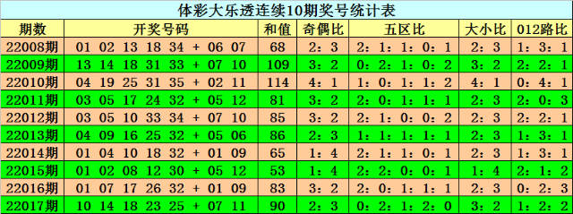 上期开奖:体彩大乐透第2022017期奖号为10 14 18 23 25 + 07 11,前区三区比为1:3:1,奇偶比为2:3,和值为90,012路比为1:2:2。