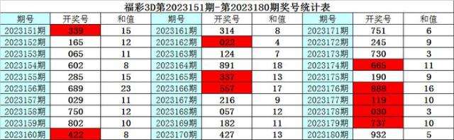 上期回顾:福彩3D第2023180期奖号为:932,其中奖号组选类型为:组六,奇偶比为2:1,大小比为1:2,012路比为2:0:1,和值为14,跨度为7。