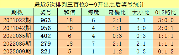 1、排列三最近两期百位号码分别开出3和9,历史上百位号码连续两期分别开出3和9的奖号出现了69期。前五期开出之后其下期奖号分别为:963、956、402、279、221;