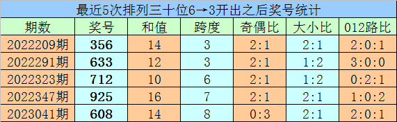 1、最近两期排列三十位号码开出号码分别为6和3,历史上十位号码连续两期同时出现号码6和3的奖号共开出82期。最近五次下期开出号码为:356、633、712、925、608;