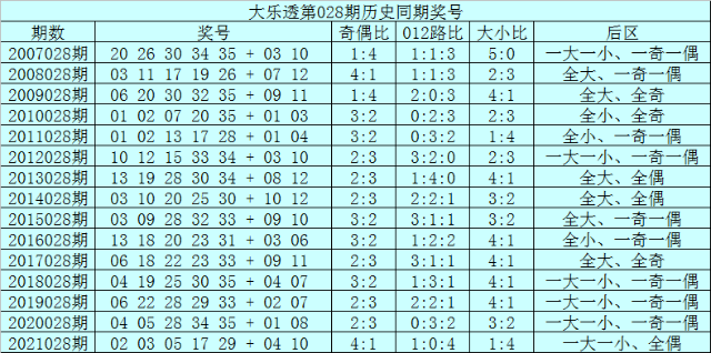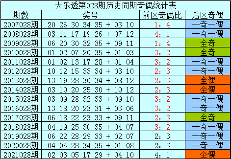 后区分析:在第028期历史同期开奖中,后区奖号奇偶比为15:15,最近5年同期后区奇偶走势为:全奇、一奇一偶、一奇一偶、一奇一偶、全偶,今年同期预计再出全偶组合,关注号码04、06。