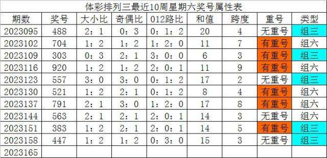 体彩排列三最近10周星期六奖号分别为:488、704、303、920、557、521、791、563、383、447,各奖号属性详见下表: