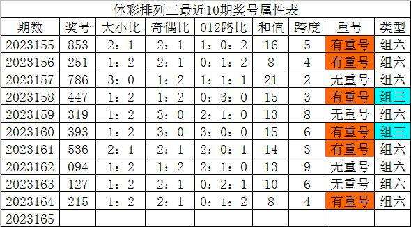 体彩排列三最近10期分别开出奖号:853、251、786、447、319、393、536、094、127、215,各奖号属性详见下表: