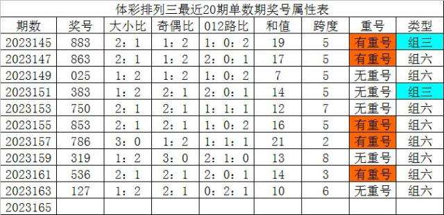 体彩排列三最近20期单数期奖号分别为:883、863、025、383、750、853、786、319、536、127,各期奖号详细属性下表:
