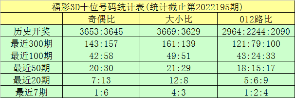 开奖回顾:福彩3D第2022195期奖号为:660。奖号形态开出组三,奇偶比开出0:3,012路比为3:0:0,大小比为2:1。