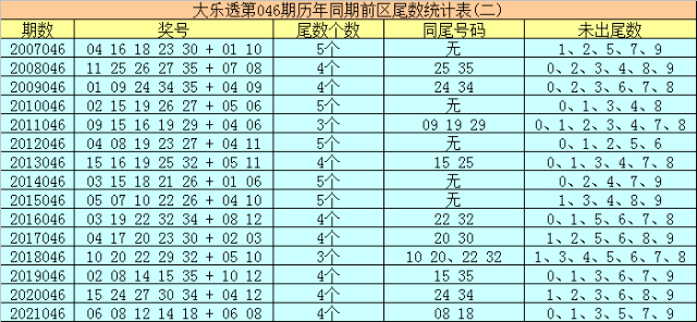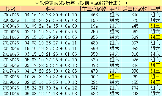 在大乐透第046期历年同期奖号中,前区前三位尾数出号频次分别为:尾数5出现7个,尾数4、9出现6个,尾数2、6、8出现5个,尾数0出现4个,尾数7出现3个,尾数1、3出现2个。其中尾数数字三类型豹子、组三、组六次数比为0:1:14,今年同期前三位尾数类型参考组六;
