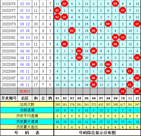后区第二位分析:在历史第089期同期奖号中,后区第二位号码全部在02-12区段出现,其中该位号码大小比为13:2,012路比为6:6:3,奇偶比为4:11,本期第二位号码关注12。