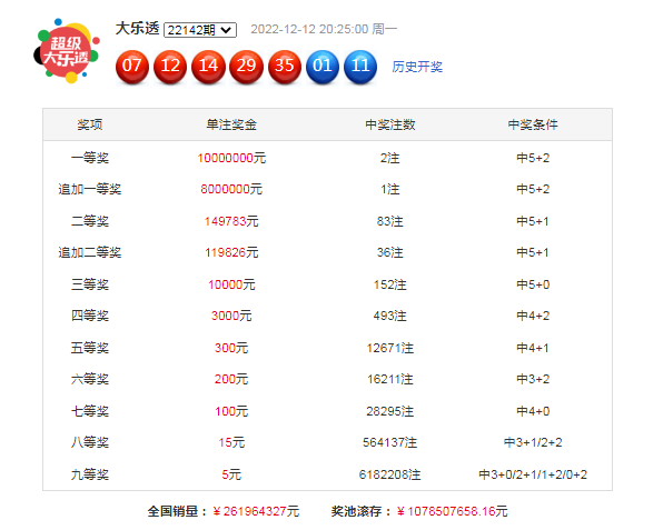 上期开奖:体彩大乐透第22142期开奖号码:07 12 14 29 35+01 11,前区和值:97,跨度:28,奇偶比:3:2,大小比:2:3,五区比:1:2:0:0:2,开出1个重号:14。