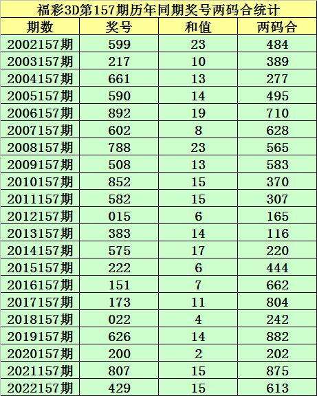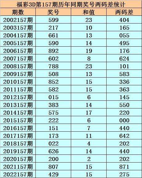 福彩3D第157期,历史上期开出21次奖号,其奖号分别为:599、217、661、590、892、602、788、508、852、582、015、383、575、222、151、173、022、626、200、807、429,奖号两码合差分别开出: