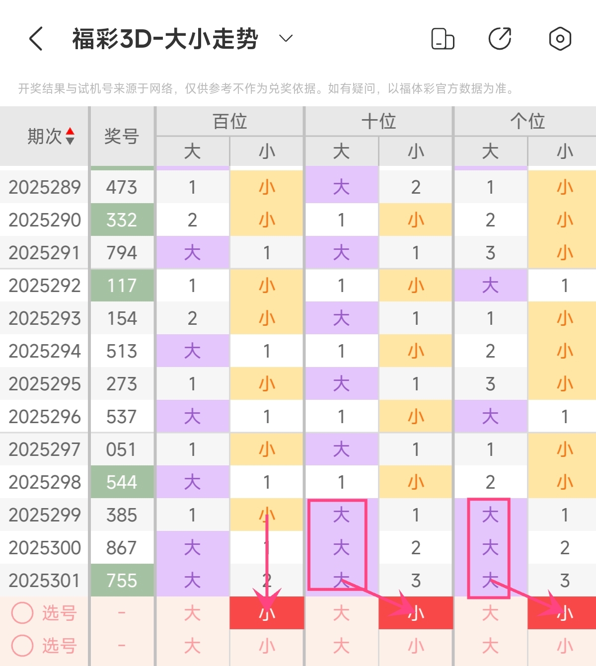 首先让我们回顾一下上期福彩3D第2025301期开奖号码为755,为组三形态,大小比为3:0,奇偶比为3:0,跨度为2,和值为17。