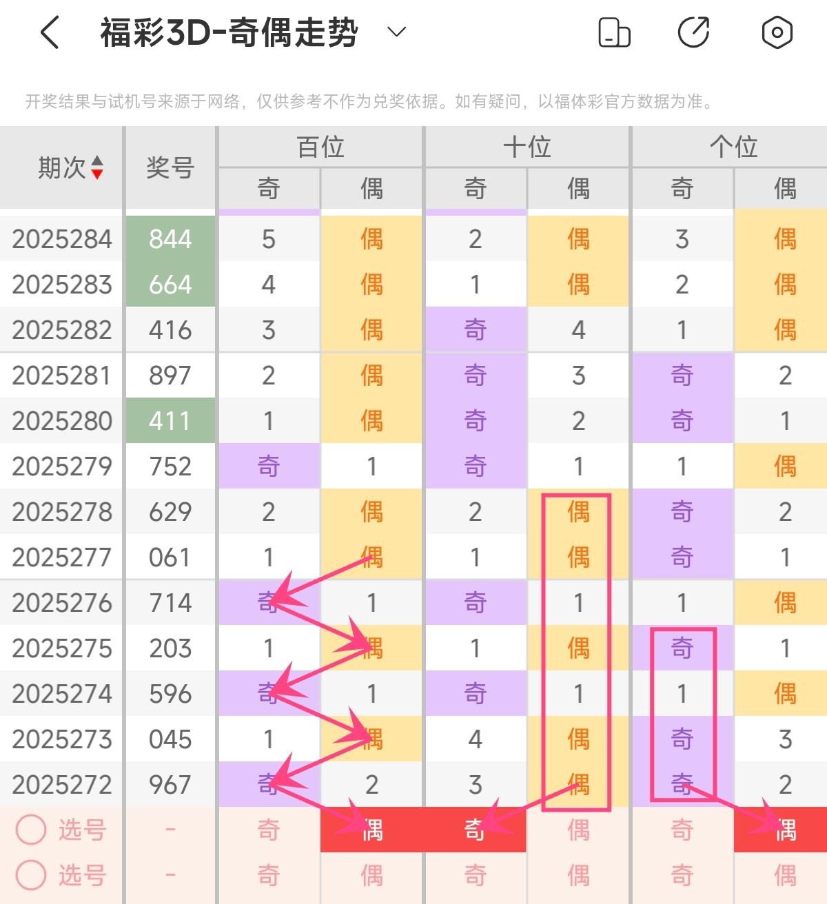 上期奇偶形态为奇奇奇,奇偶比为3:0,奇数占优,全奇组合。根据近期奇偶形态变化来看,近期奇偶形态变化频繁,上期奇偶形态开出全奇组合较为极端,本期需注意偶数号码的反弹。预计本期奇偶形态会回补偶数号码占优组合。预计本期可关注奇偶比1:2,偶数占优组合 。本期奇偶形态可重点关注:偶奇偶。