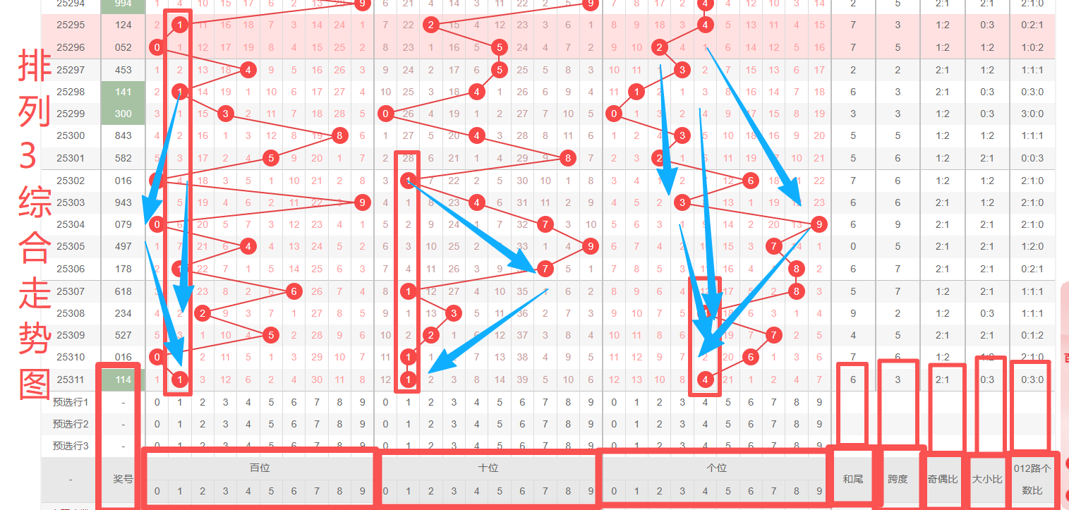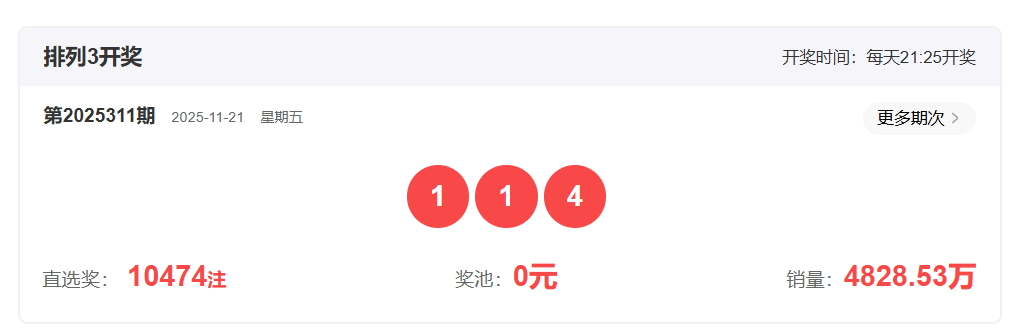 体彩排列3第2025311开奖号码114,形态为组三,奇偶比2:1,和值6,跨度3,大小比0:3,【012】路个数比0:3:0。