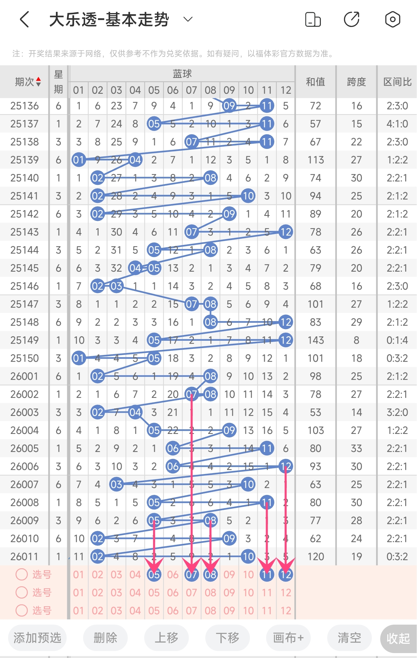 上期开出了2,10号球。往前一期开出了2,9号球。通过分析蓝区走势图,我们可以看到上期跨度是比较大的,连续2期比较大了,推测本期大概率会变小,可以关注彼此比较接近的号码。最后再结合冷热号情况以及遗漏期数,本期我们可以关注5,7,8,11,12等号。综上所述本期我们推测可能开出5,7,8,11,12等号码。